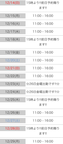 12月後半の出勤予定♡ 12/13 20:07